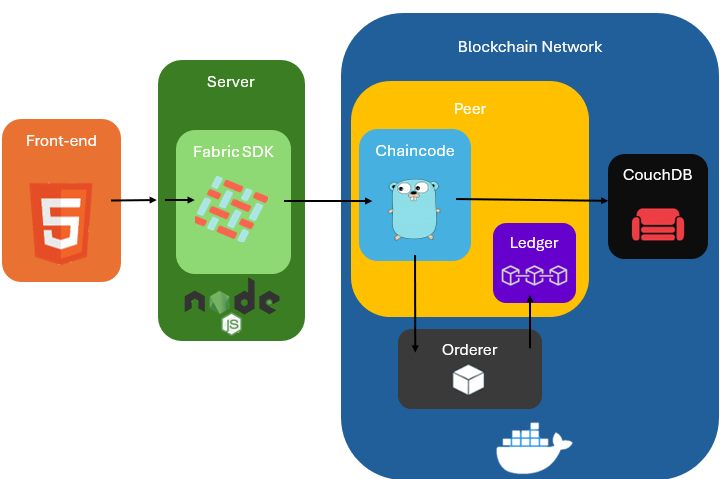- Blockchain network componentes like orderes,peers,CouchDBs run as Docker containers